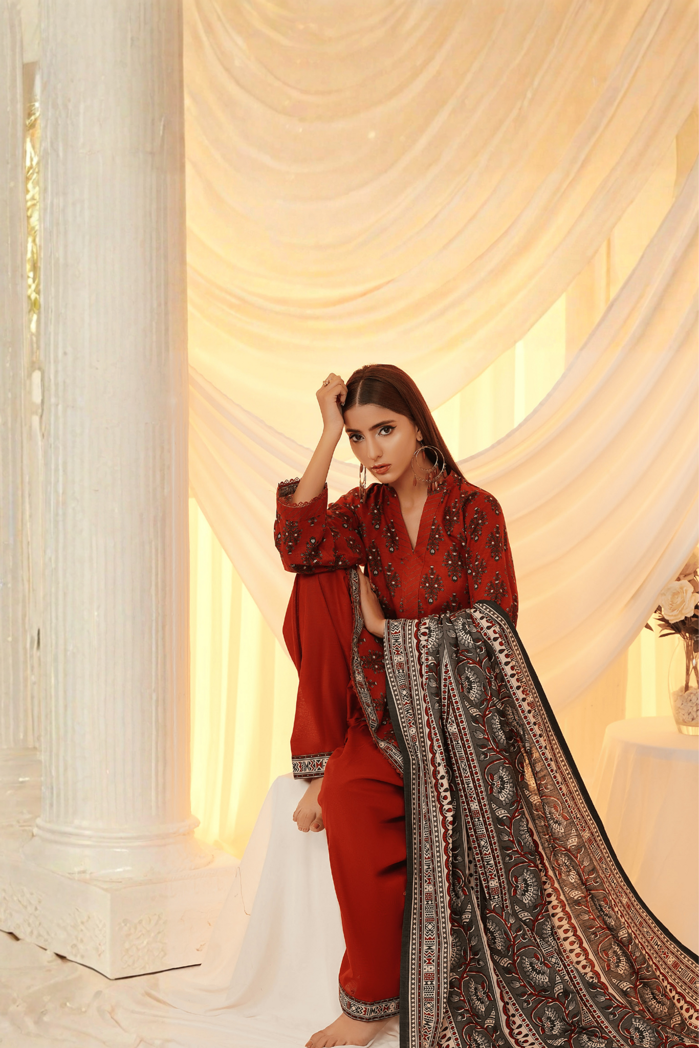 3 Pieces - Regalia Unstitched Maroon Printed Khaddar Suit