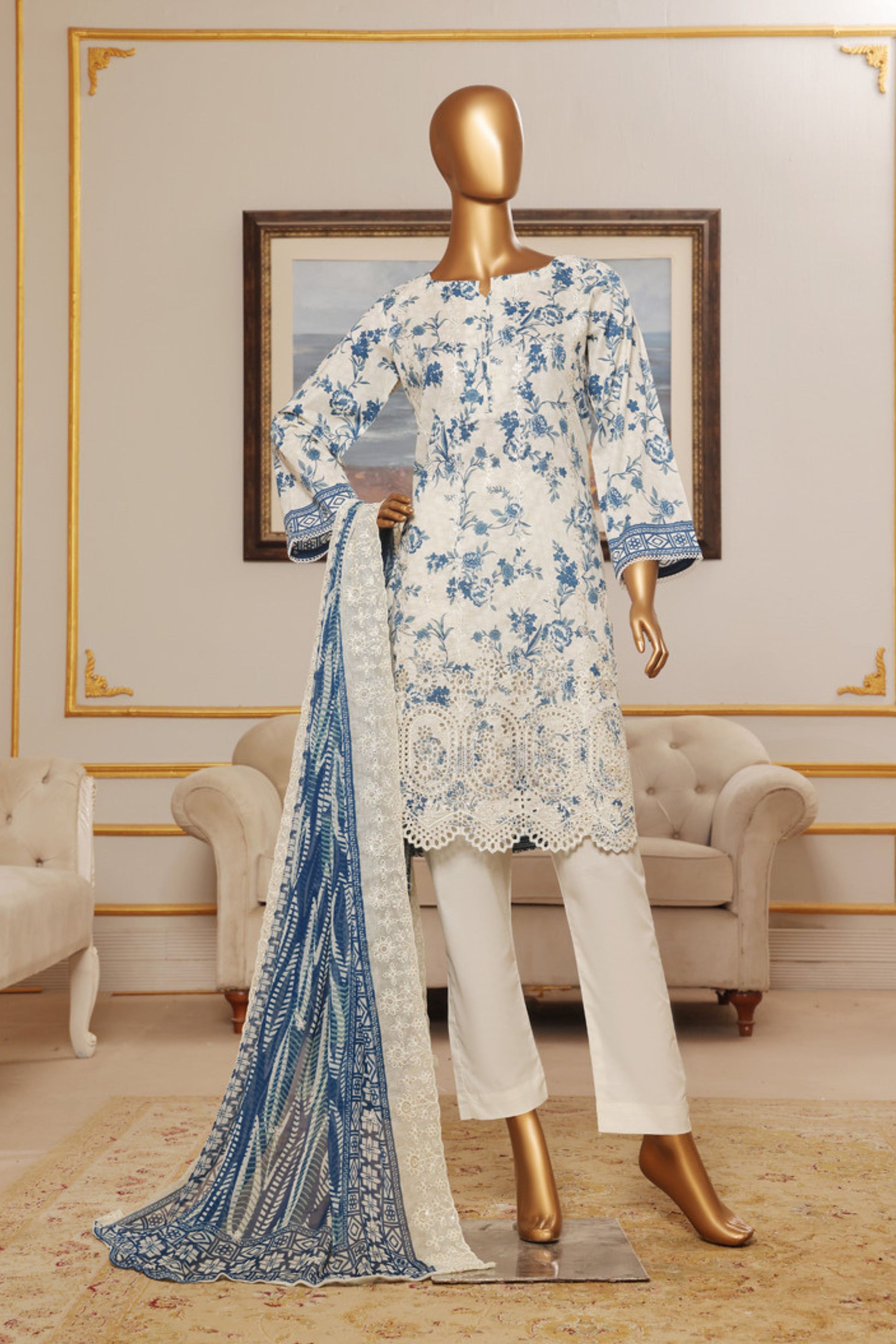 Embroidered Chiffon Dupatta: The dupatta is a stunning piece made of light, flowing chiffon. It features a beautiful floral and geometric print in shades of blue and white, with an elegant cutwork border that perfectly complements the shirt.