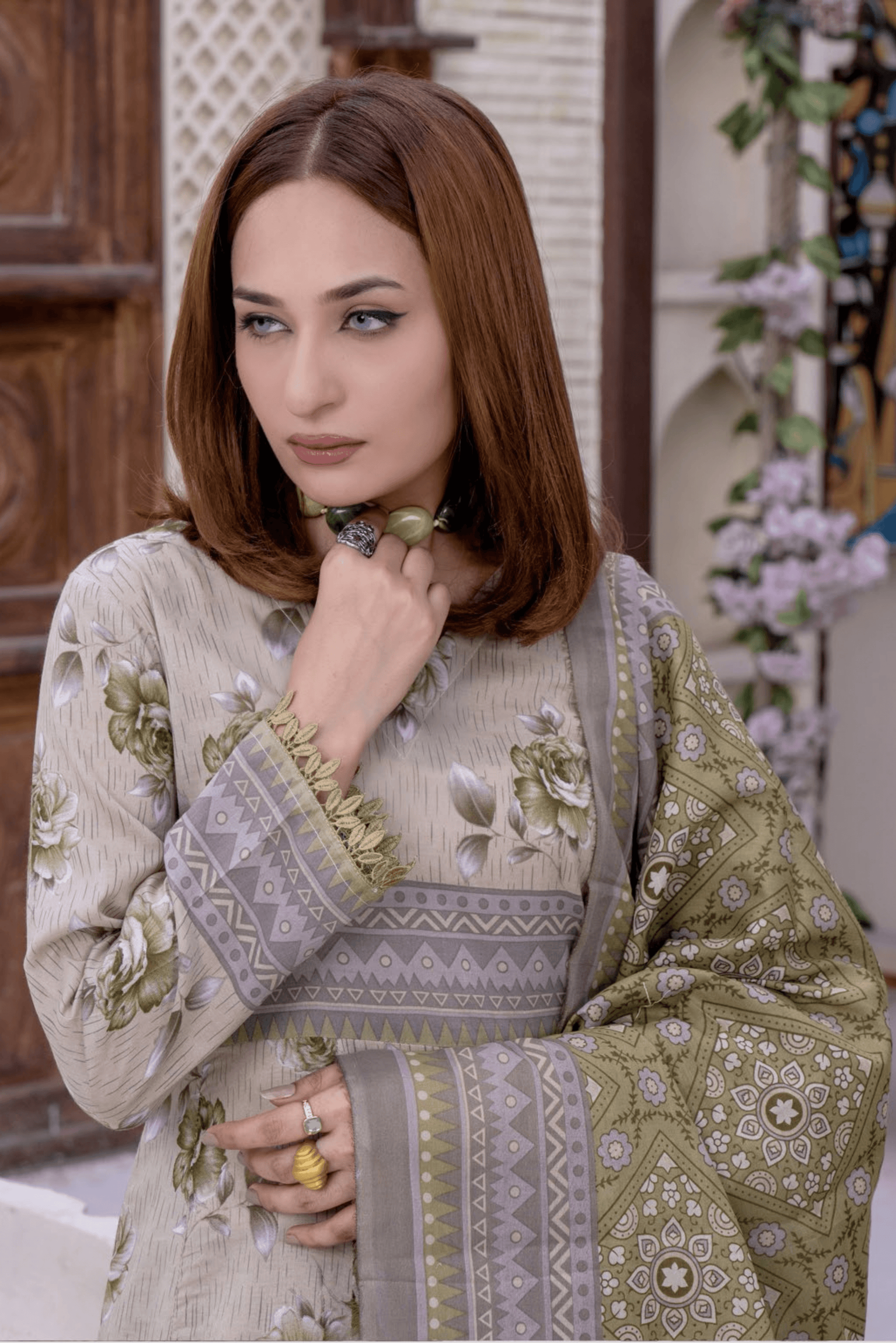 Printed Lawn Dupatta: The dupatta is in a stunning olive green with a detailed geometric and floral print in grey and lavender. The intricate motifs and contrasting tones provide a perfect balance to the shirt's floral pattern, creating a cohesive and stylish ensemble.