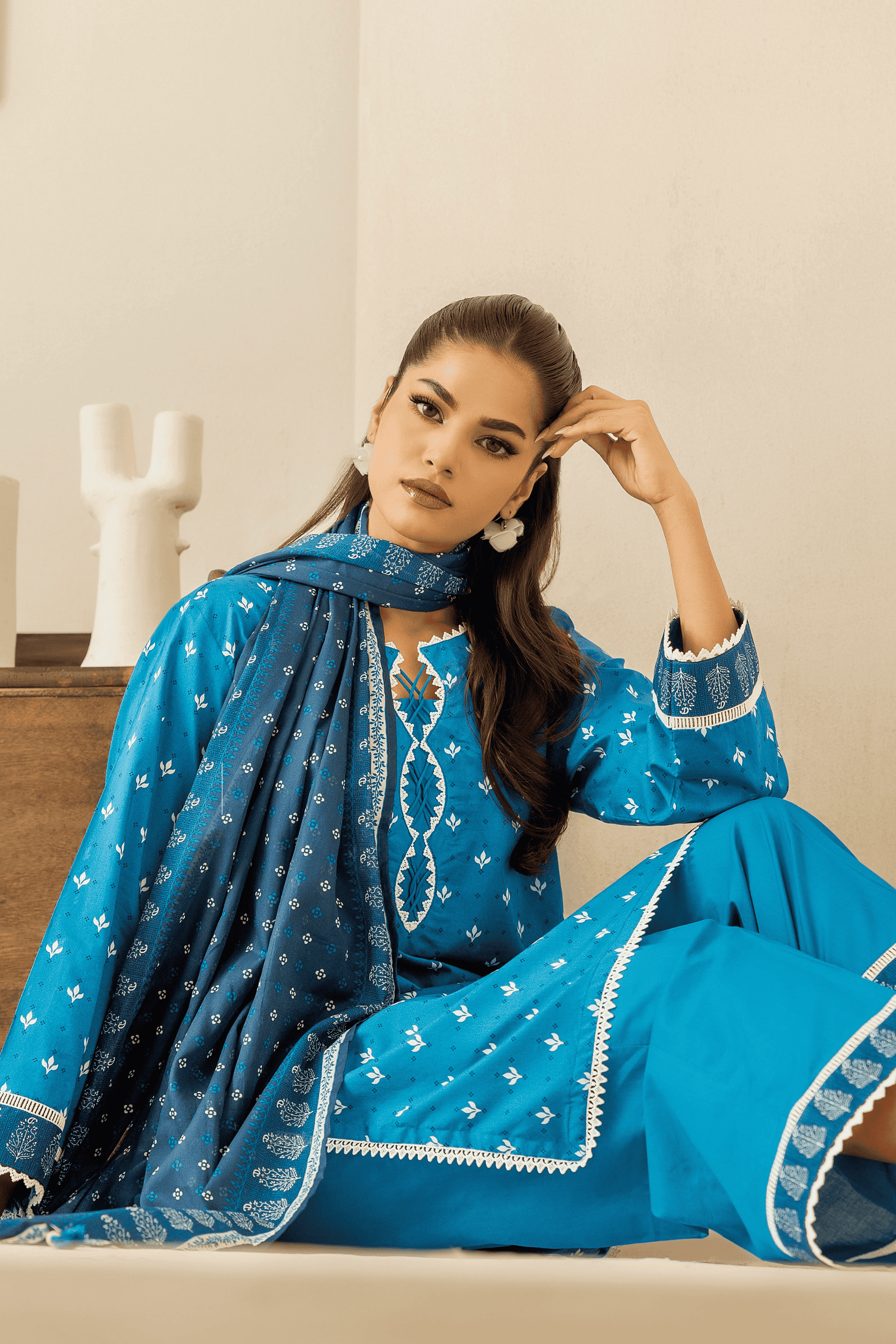 Printed Lawn Shirt: The unstitched fabric features a vibrant sky blue Lawn base adorned with a repetitive, small white floral motif spread across the entire shirt. The unique neckline features an intricate cutout design with white lace trimming and the sleeves are finished with a broad navy blue ornamental border. This combination of bright tones and detailed accents creates a fresh, modern aesthetic.