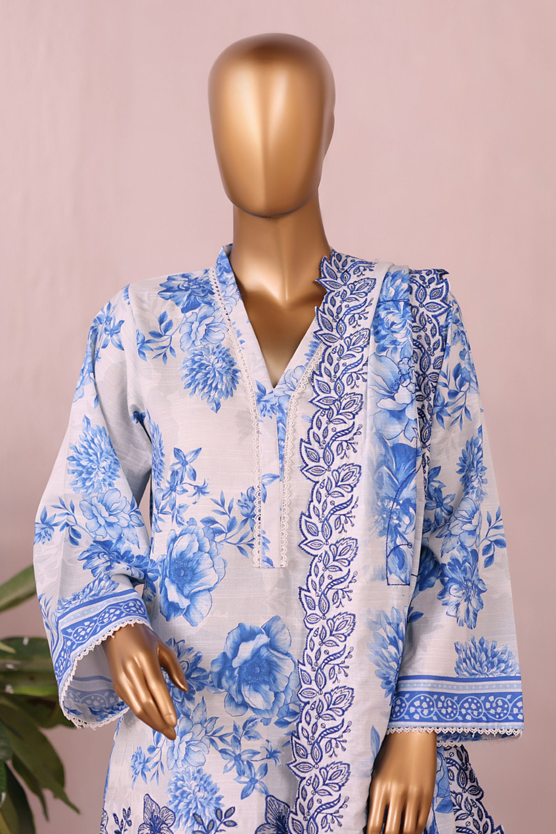 Embroidered Dupatta: The dupatta matches the base tone with a bold, flowing floral print in blue and sky blue watercolor effects. The entire border is finished with a wide, scalloped white cutwork embroidery trim, providing a luxurious and cohesive border detail.