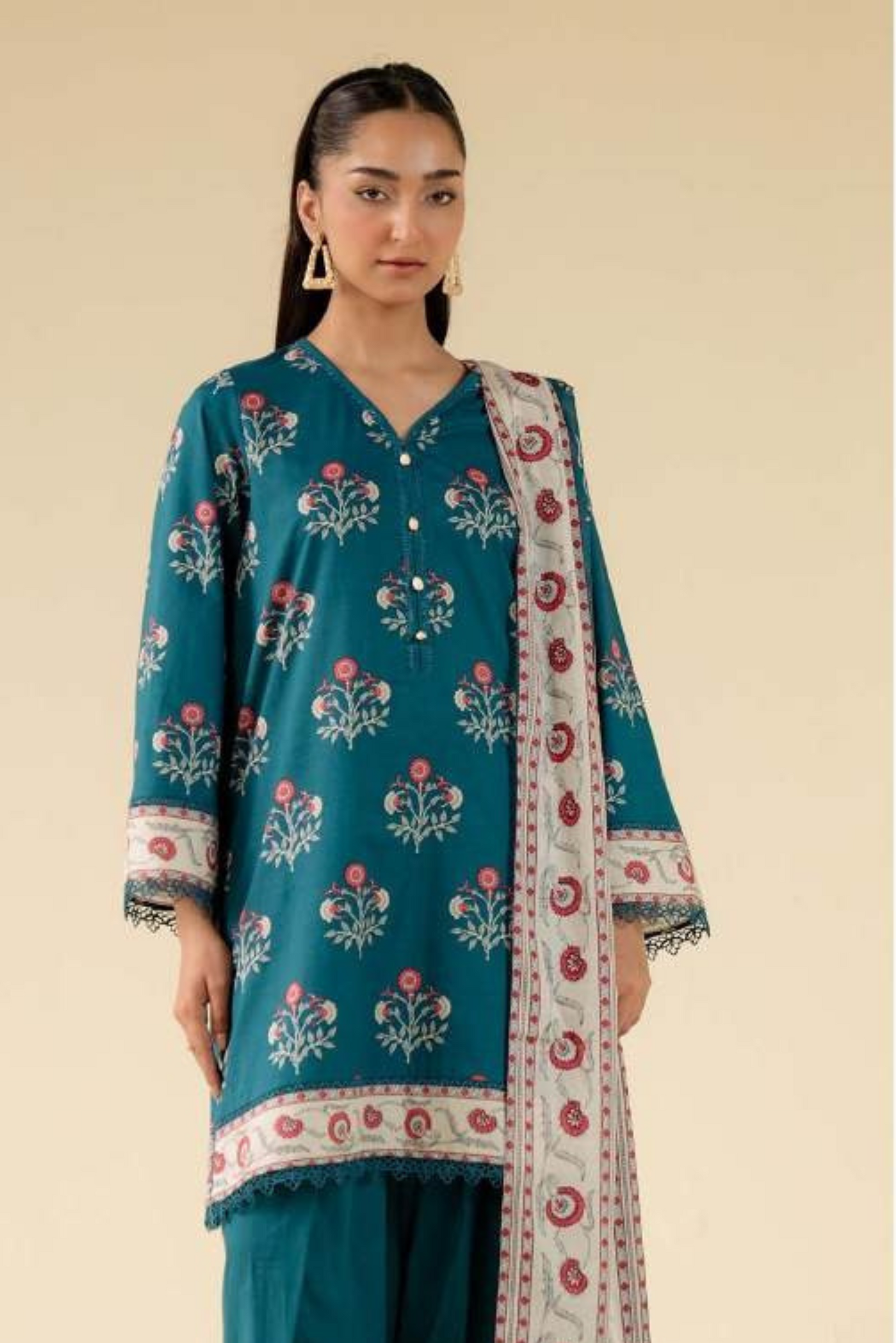 Printed Lawn Dupatta: The dupatta features a beautiful mix of patterns. It has a stunning floral and paisley print on a light gray base, with bold borders that perfectly complement the shirt, creating a striking and harmonious look.