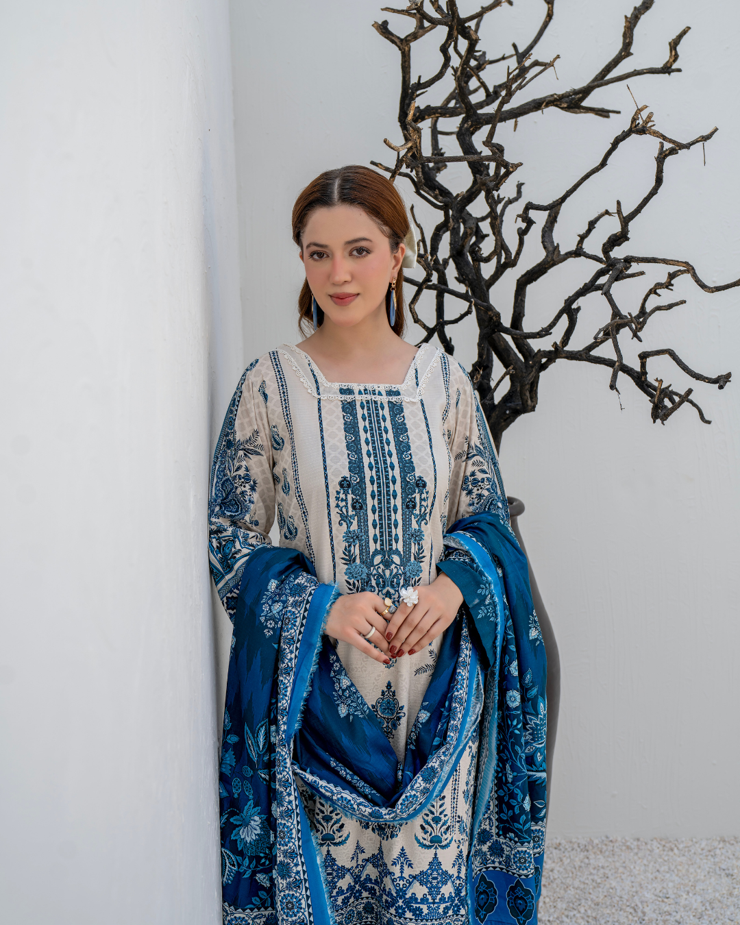 Printed Linen Dupatta: The dupatta coordinates with the off-white base but is predominantly covered in the vibrant blue ornamental and geometric print, creating a dramatic contrast. The edges are framed by thick borders in the deep blue, enhancing the rich, decorative patterns.