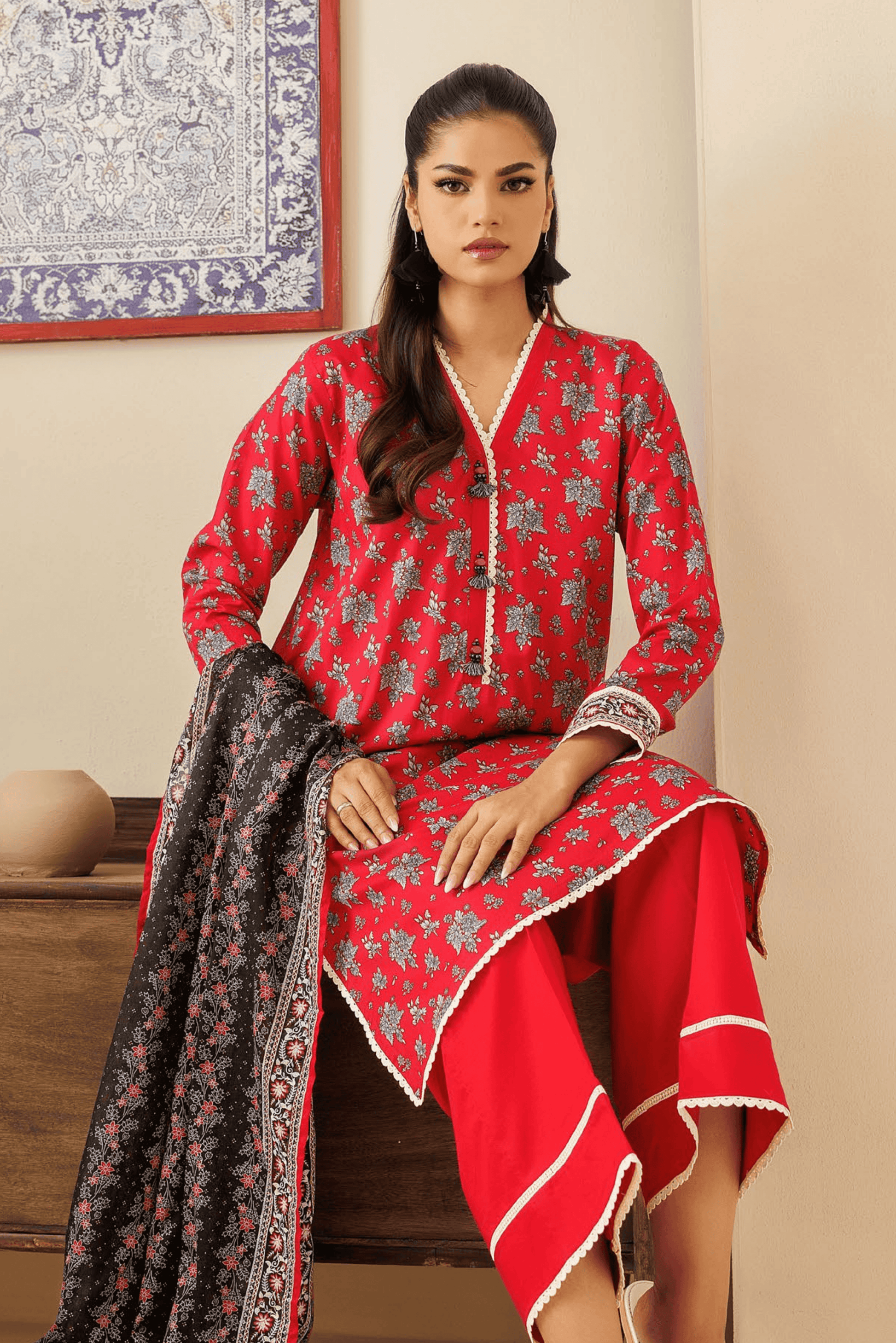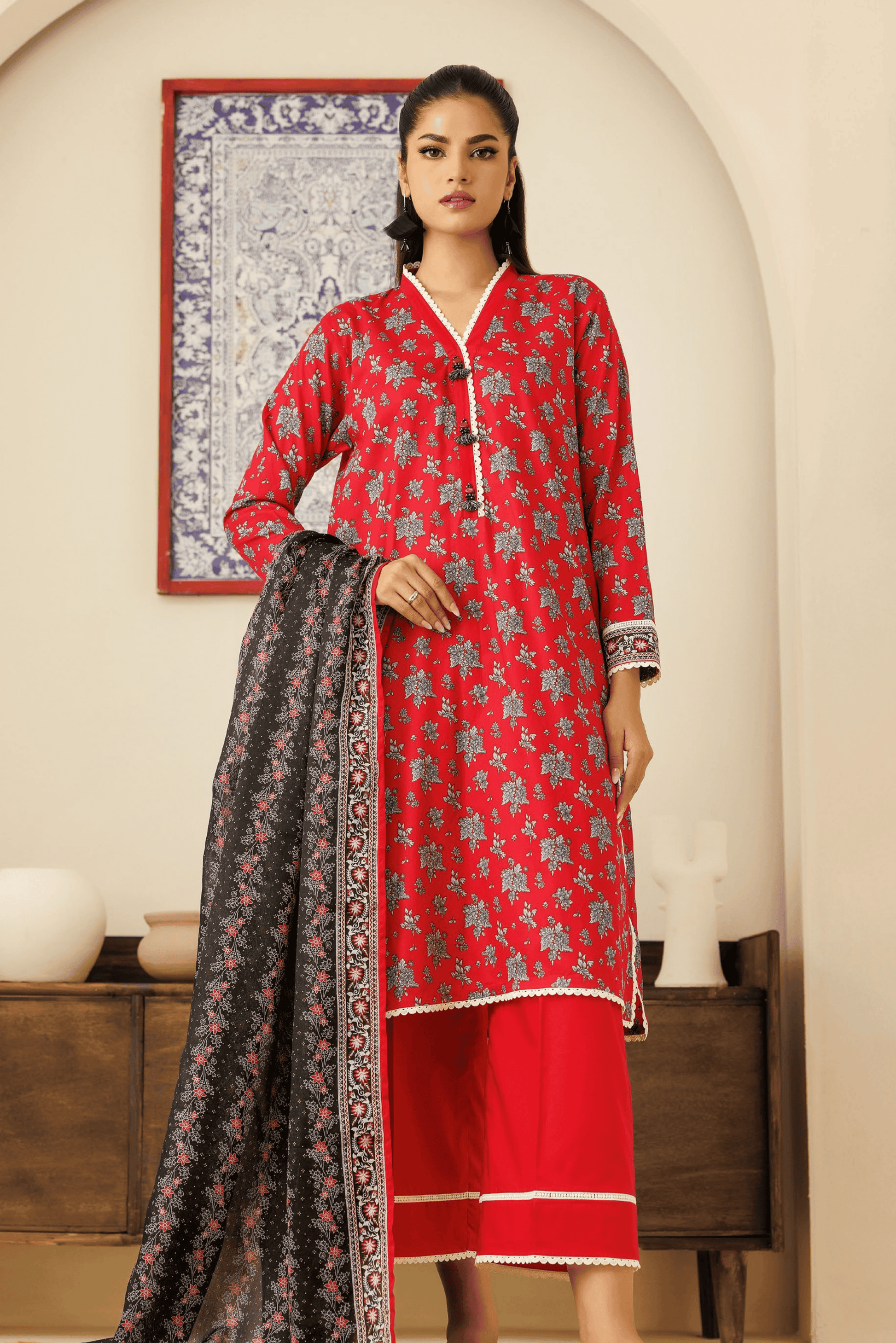 Printed Lawn Shirt: The unstitched fabric features a bold red Lawn base covered in a dense, all-over print of grey and black floral clusters. The V-neckline, hem, and sleeve cuffs are elegantly finished with delicate white lace edging, while the sleeves also feature a structured ornamental border. This high-contrast design offers a vibrant and classic aesthetic for seasonal wear.