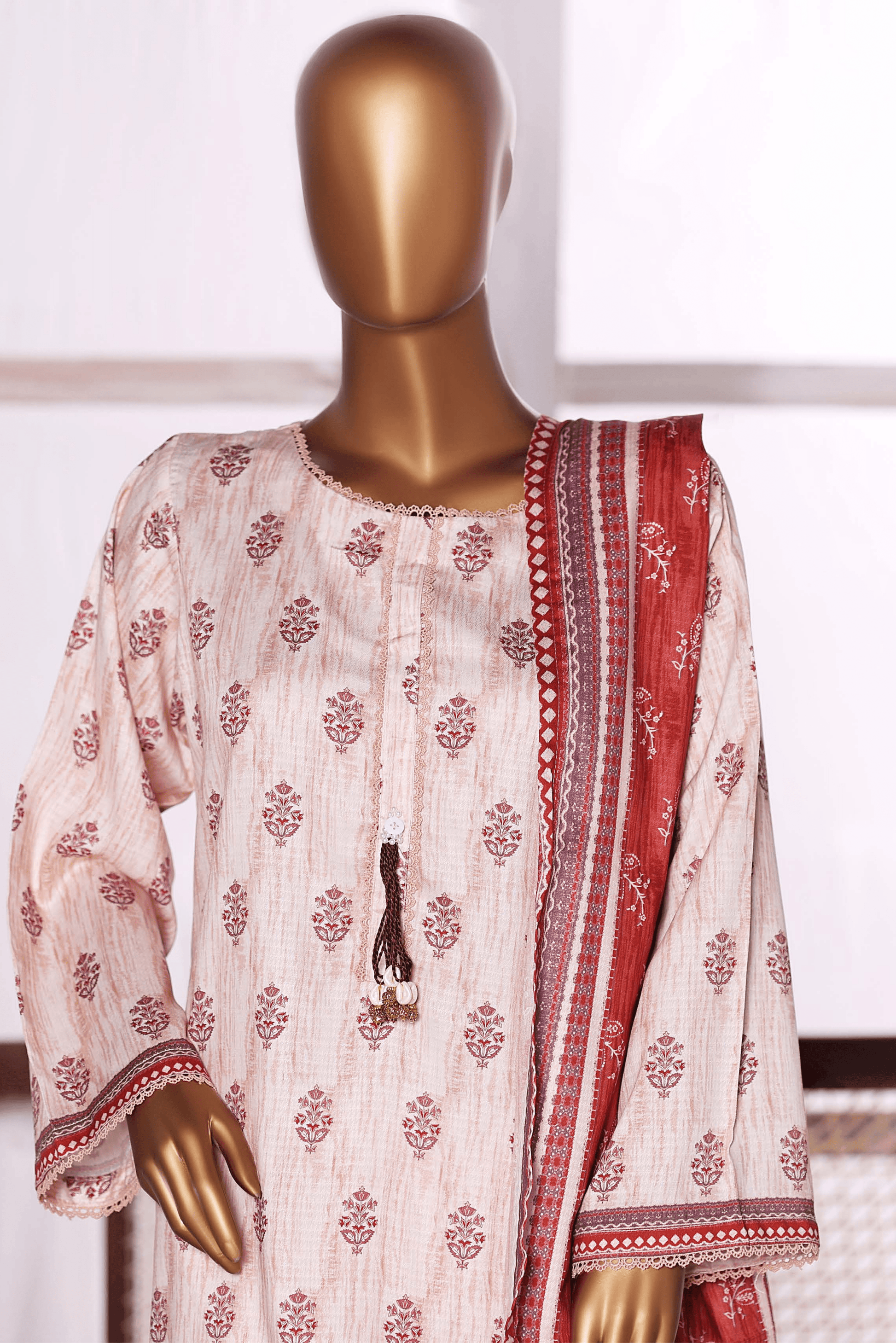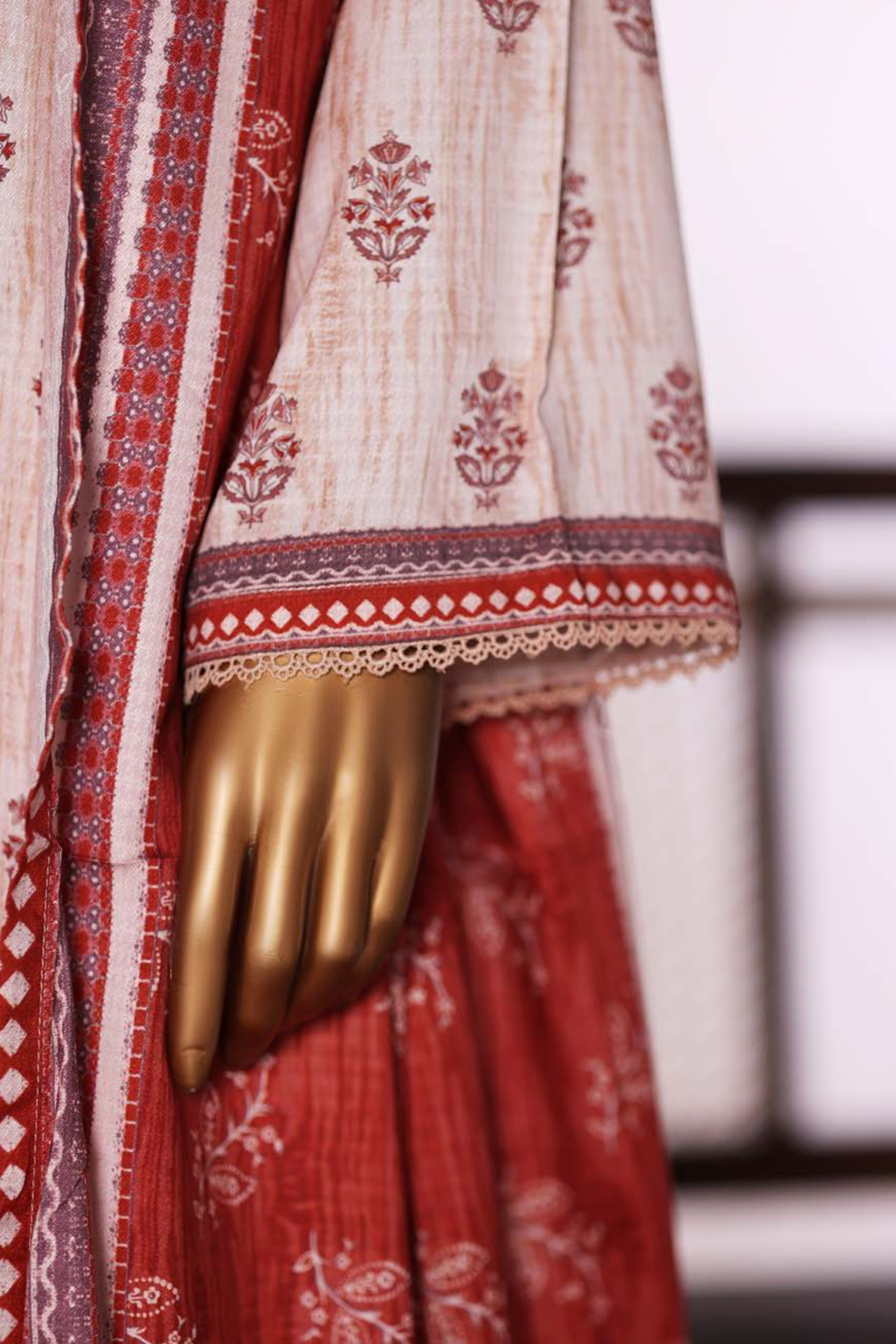 Plain Dobby Viscose Trousers: The trousers are made from solid, dyed Dobby Viscose fabric in a clean off-white or light beige tone that matches the shirt's base. Their simple, unprinted finish provides a smooth, light-colored block that allows the dramatic red print of the dupatta to be the main focus.